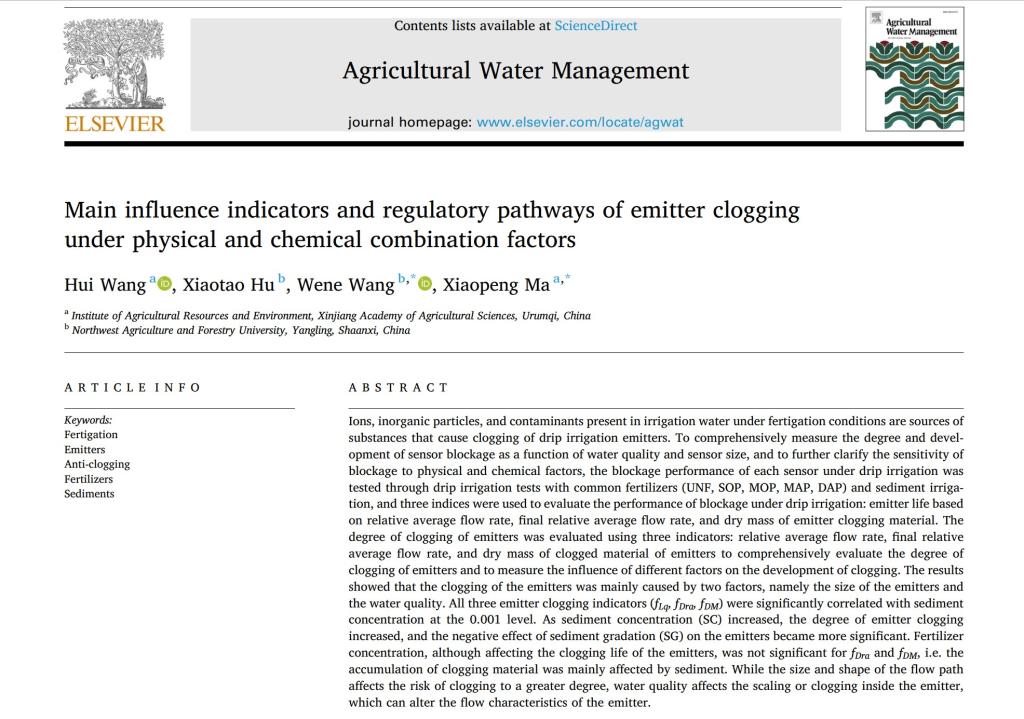近日,自治区农科院农业资源与环境研究所农业水资源高效利用创新团队在国际权威期刊《Agricultural Water Management》上发表了题为“Main influence indicators and regulatory pathways of emitter clogging under physical and chemical combination factors”的研究论文(IF=5.9/Q1)。该研究系统揭示了灌水器堵塞的动态机制及核心影响因素,为优化灌溉系统设计、提升水资源利用效率提供了重要理论支撑。滴灌技术是干旱区农...