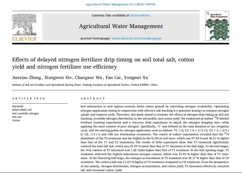 近日,自治区农科院农业资源与环境研究所农业水资源高效利用创新团队和土壤质量与产能提升创新团队联合在国际知名期刊《Agricultural Water Management》发表了题为“Effects of delayed nitrogen fertilizer drip timing on soil total salt, cotton yield and nitrogen fertilizer use efficiency”的研究论文(IF=5.9/Q1),为盐渍化棉田水肥一体技术应用提供了基础理论参考。新疆棉花生产受到土壤盐渍化的严重挑战,不仅限...