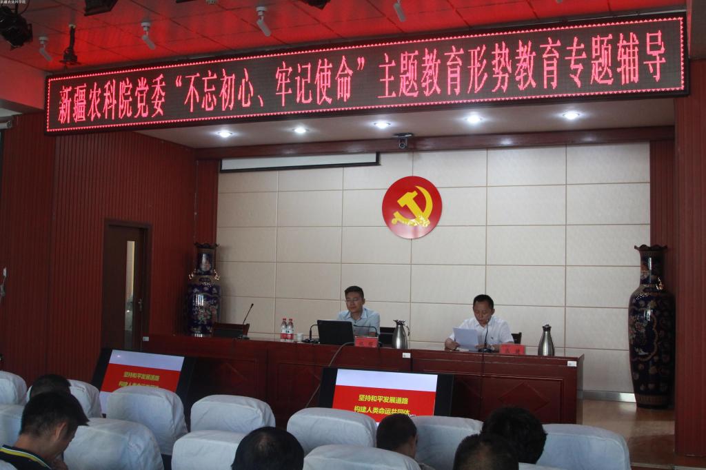 为深入开展“不忘初心、牢记使命”主题教育,8月9日,我院邀请自治区党委党校政治学教研部副主任、副教授祝辉为我院作题为《坚持和平发展道路,构建人类命运共同体》的专题辅导。院党委班子成员、全院副处级以上领导干...