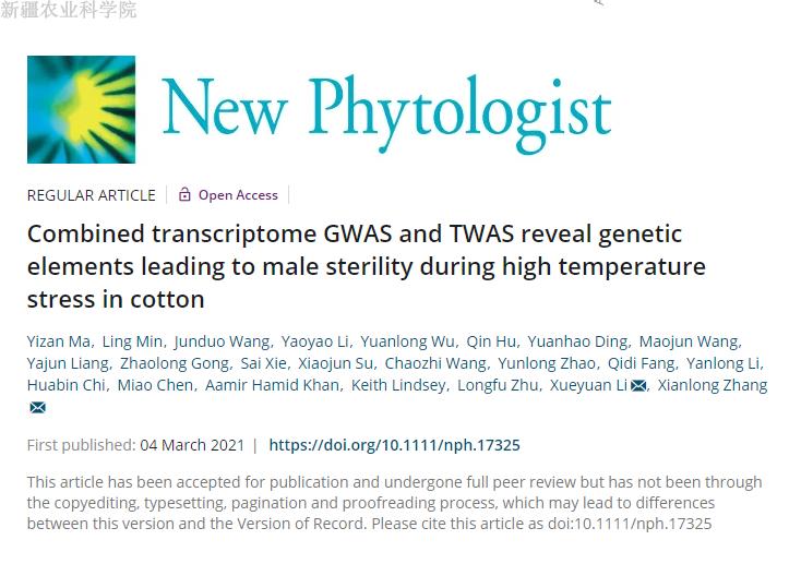 近日,依托国家自然基金NFSC-新疆联合基金重点支持项目,我院经作所陆地棉育种团队与华中农大、湖南农大、中科院植物所针对棉花花粉育性对高温胁迫下的逆境响应分子机理开展的联合攻关取得重要进展,并在New Phytolo...