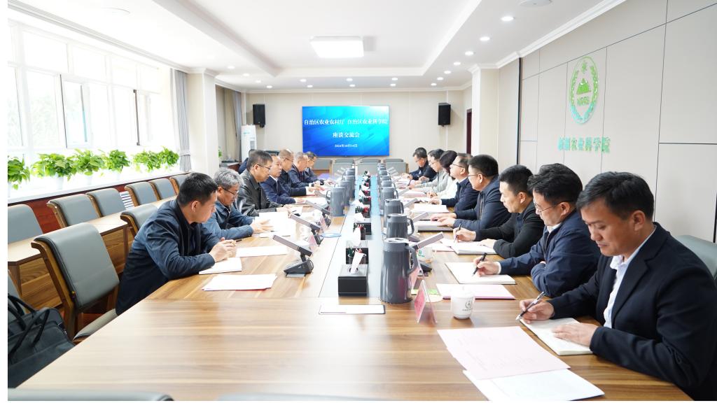 10月14日上午,自治区党委农办主任、农业农村厅党组书记谢映周,自治区农业农村厅党组成员、副厅长张普江,自治区农业农村厅总农艺师刘晓峰等一行来我院调研指导并座谈交流。我院党委书记、副院长马缨陪同调研并主持座谈会,党委副书记、院长余庆辉、党委副书记彭守创、党委委员、副院长戴俊生,以及相关机关处室、研究所负责同志参加会议。双方围绕推动农业科技创新、建立合作机制等内容进行深入交流,并达成初步合作共识。谢...