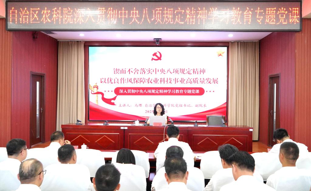 7月4日上午,自治区农科院召开深入贯彻中央八项规定精神学习教育专题党课报告会,自治区农科院党组书记、副院长马缨以《锲而不舍落实中央八项规定精神 以优良作风保障农业科技事业高质量发展》为题作党课报告,院党组副书记、副院长彭守创主持报告会。在家院领导班子成员、处级领导干部、机关干部以及院属研究所、试验站支委和党员代表近200人参会。马缨指出,党的十八大以来,习近平总书记围绕加强党的作风建设发表一系列重要...