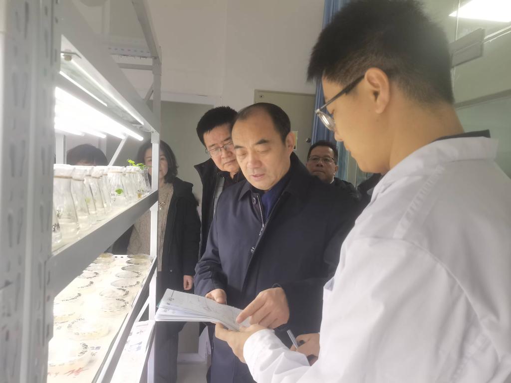 王成一行先后实地调研了我院刚刚完成竣工验收的“新疆农作物种质资源保存与创新利用中心”,园艺所“新疆特色果蔬基因组研究与遗传改良重点实验室”、核生所“新疆农作物生物技术重点实验室”和土肥所“新疆耕地保护科技创新中心”,相关负责同志向调研组详细介绍了取得的科研成果和科技支撑自治区农业产业高质量发展情况。每到一处,王成都与我院专家亲切交谈,详细了解了“基因编辑”等生物育种基础前沿理论、新疆盐碱地改良与综合利用的具体举措、重大科研项目的实施进展、拟突破的关键核心技术、科技成果产业化应用等方面的情况,勉励科技人员加快重大科技成果产出。