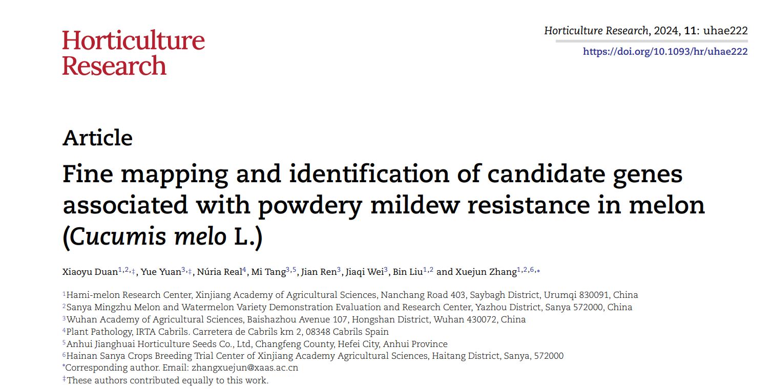 近日,我院哈密瓜研究中心西甜瓜分子设计育种创新团队在知名期刊《Horticulture Research》发表了题为“Fine mapping and identification of candidate genes associated with powdery mildew resistance in melon (Cucumis meloL.)”(IF=7.6/Q1)的研究论文,研究揭示了甜瓜白粉病抗性关键基因。