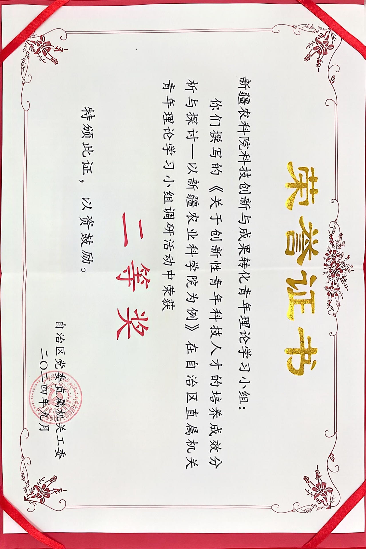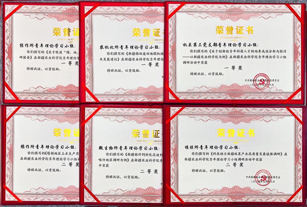 经院机关党委组织专家评审,评选出一等奖3篇、二等奖5篇、三等奖10篇、优秀奖11篇。评选出的优秀篇目推荐参加了自治区直属机关青年理论学习小组调研活动,其中院机关第三党支部报送的调研报告《关于创新性青年科技人才的培养成效分析与探讨—以jc聚彩网为例》,荣获二等奖。经认真修改完善,优秀调研报告已在《新疆农业科学》第61卷(2024年增刊)“青年理论学习小组调研报告”专题上发表。