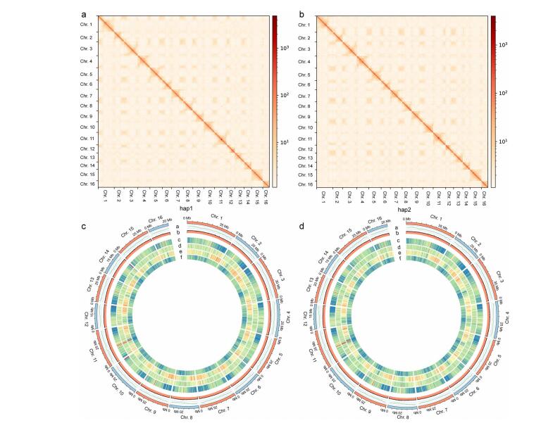 野生种质资源因具有特殊性状,对基因挖掘和分子育种至关重要。新疆野生核桃是我国珍稀的野生植物资源,长期的进化过程中形成了许多特有变异,具有很大的研究利用潜力。该团队调查了新疆野生核桃树的基因组大小和杂合性,并使用PacBio HiFi和Hi-C技术组装了单倍型的基因组。其中一个单倍型(hap1)的基因组大小为562.99 Mb(contig N50=34.10 Mb),另一个单倍型(hap2)的基因组大小为561.07 Mb(contig N50=33.91 Mb),分别有527.20 Mb(93.64%)和526.40 Mb(93.82%)的序列挂载到16个假染色体,分别预测了41039和39744个蛋白质编码基因。此外,在两个单倍型基因组之间还发现了123个结构变异(SVs)。最后确定了新疆野生核桃响应冷胁迫的等位基因特异性表达基因(ASEGs)。这些数据集可用于研究核桃亚基因组进化、优良基因挖掘和新疆野生核桃特定环境适应特性的转录基础。