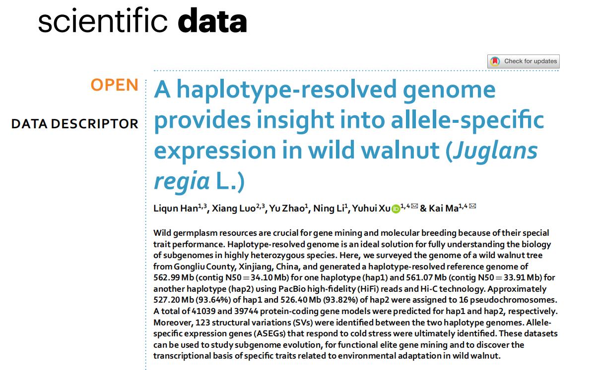 近日,我院园艺所核桃创新团队在国际知名期刊《scientific data》在线发表了题为“A haplotype-resolved genomeprovides insight into allele-specificexpression in wild walnut (Juglans regiaL.)”的研究论文(IF=9.8/Q1),为等位基因特异性表达基因的研究提供了新思路。