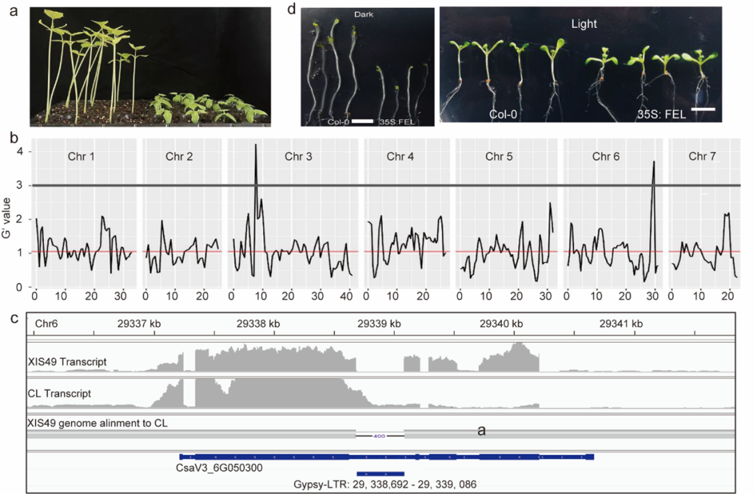 该研究结合比较基因组学、正向遗传学和分子生物学等方法,利用耐弱光的半野生黄瓜材料XIS49挖掘到两个控制下胚轴弱光伸长的基因:位于3号染色体的SH3.1和位于6号染色体的SH6.1。SH3.1编码一个光敏色素蛋白Phytochrome B (PhyB),SH6.1编码一个CCCH类型的锌指蛋白FRIGIDA-ESSENTIAL LIKE (FEL)。