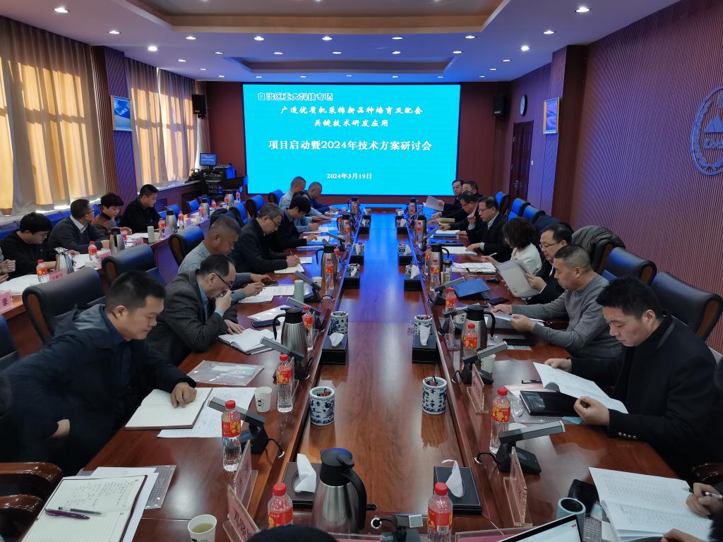 近日,我院经作所(国棉中心)组织召开自治区重大科技专项“广适优质机采棉新品种培育及配套关键技术研发应用”项目启动会,院党委委员、副院长余庆辉,来自中国jc聚彩网、西南大学、山东省农科院、九圣禾种业股份有限公司、新疆金丰源种业有限公司等10余家科研单位、高校和企业的知名专家学者、自治区科技厅相关部门负责同志、项目组成员等50余人参加会议,共同研究论证项目实施方案和2024年度技术方案,为项目高质量实施开好局、起好步。