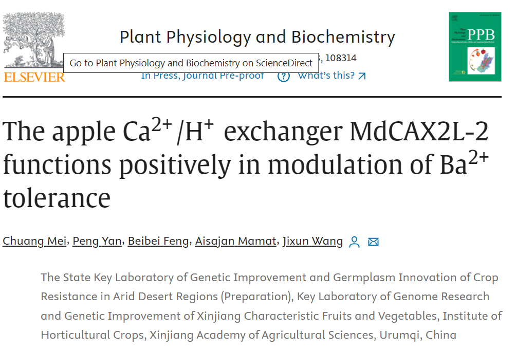 近日,我院园艺所苹果创新团队在国际知名期刊《Plant Physiology and Biochemisty》在线发表了题为“The apple Ca2+/H+ exchanger MdCAX2L-2 functions positively in modulation of Ba2+tolerance”的研究论文(IF=6.5/Q1)