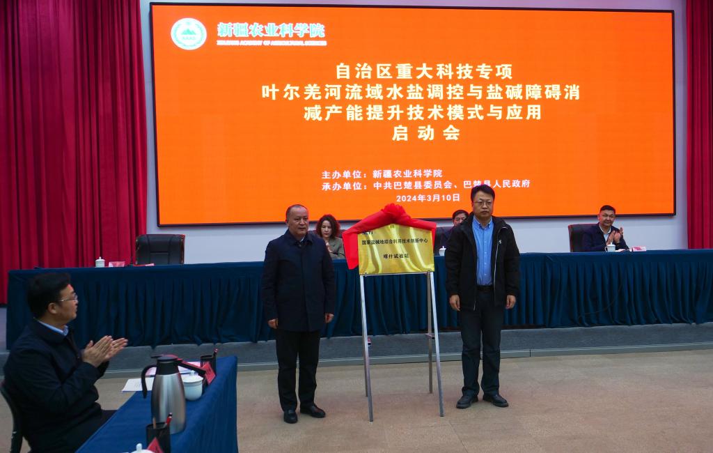 启动会上,国家盐碱地综合利用技术创新中心-喀什试验站站长徐万里和巴楚县县长阿布拉江·吐尔逊为国家盐碱地综合利用技术创新中心-喀什试验站(巴楚站)揭牌,项目组将以该试验站为平台,加强技术创新与科技服务,共同为叶尔羌河流域盐碱地综合治理提供全方位的技术支持。(土肥所 邵华伟 孟阿静)