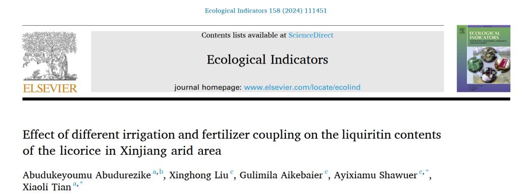 近日,我院科研人员在《Ecological Indicators》(IF=6.9)在线发表了题为“Effect of different irrigation and fertilizer coupling on the liquiritin contents of the licorice in Xinjiang arid area”的研究论文。该研究揭示了不同水肥耦合对甘草中草苷含量的响应机制,为新疆干旱区甘草滴灌高效栽培提供了理论依据。