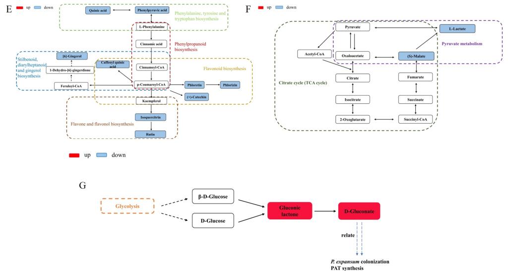 采用非靶向代谢组学技术揭示感染相同病斑直径(冷藏24 d和室温7 d)的苹果之间的代谢物变化,结果显示有机酸、脂类、黄酮类、糖类等代谢产物的含量差异明显。与常温处理相比,冷藏处理下苹果中抗病相关代谢通路下调,PAT合成相关代谢通路上调。研究结果为苹果中PAT的防控提供了理论依据。