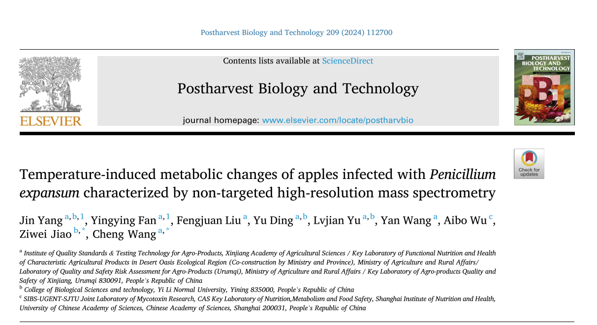 近日,国际知名期刊Postharvest Biology and Technology在线发表了我院质标所农产品质量与风险评估创新团队的研究论文“Temperature-induced metabolic changes of apples infected withPenicillium expansumcharacterized by non-targeted high-resolution mass spectrometry”(IF=7.0)。