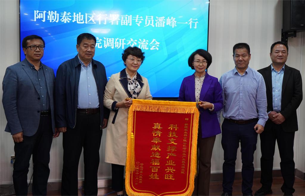 座谈会期间,潘峰副专员、哈巴河县政协党组书记姜振东代表哈巴河县委、县人民政府给我院赠送锦旗,以表达对哈巴河县农业产业提供强有力科技支撑的感谢。(办公室 杨波)