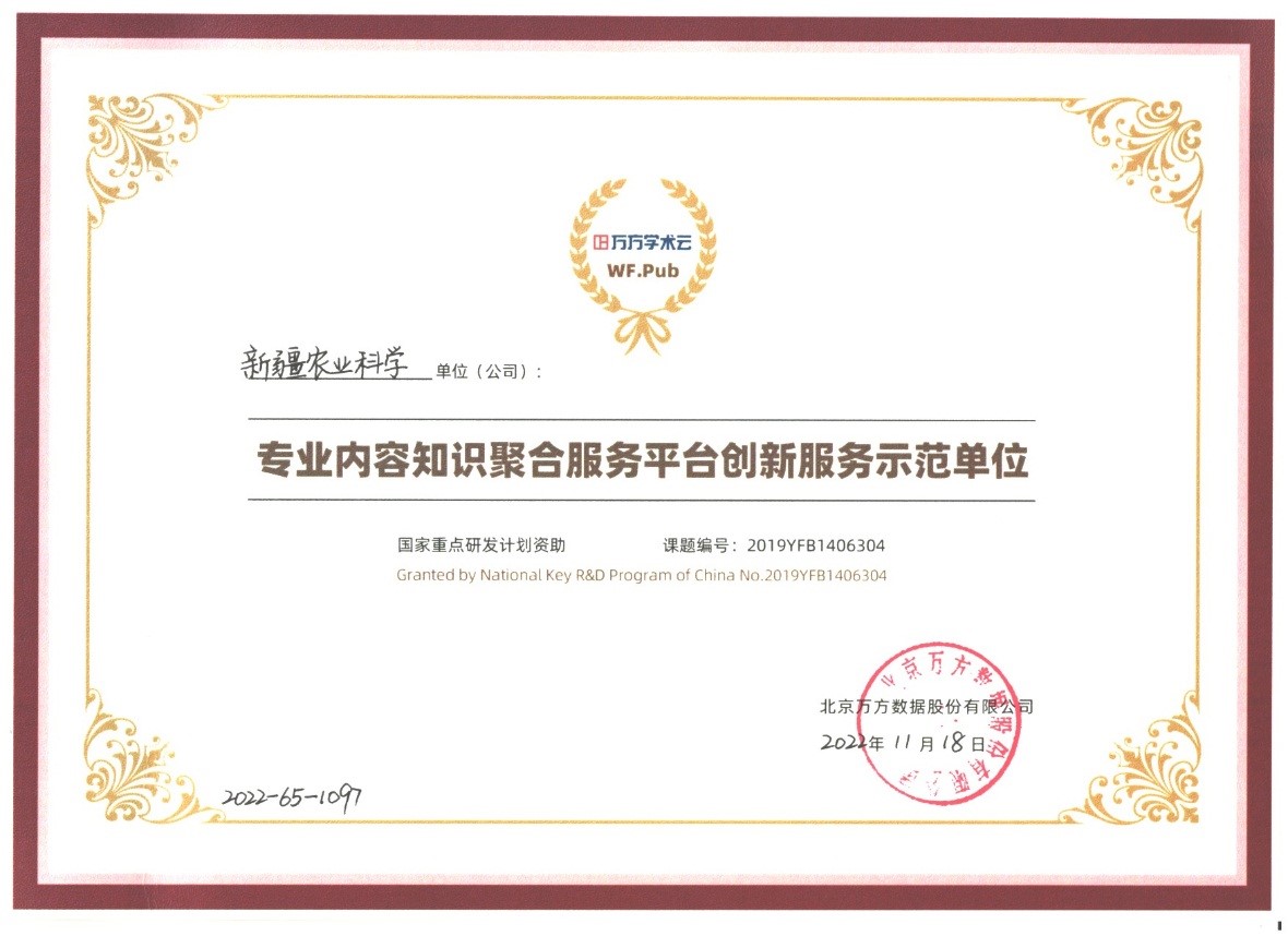 近日,《新疆农业科学》荣获北京万方数据股份有限公司颁发“专业内容知识聚合服务平台创新服务示范单位”称号。