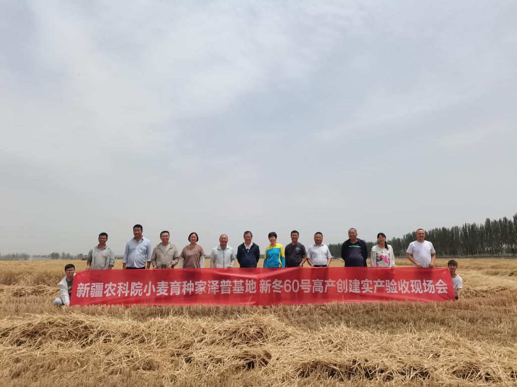 6月26日,在喀什地区泽普县,来自科研院校、农技推广中心、种子管理部门共同组成的测产专家组,对在新疆农科院小麦育种家泽普基地建立的50亩“新冬60号”小麦高产示范田进行了测产。经现场实收测产,平均亩产771.88公斤,测产专家组组长、新疆农业大学教授、小麦专家石书兵宣布了测产结果。这标志着新疆农科院粮作所选育的“新冬60号”早熟冬小麦品种,继2019年731.3公斤和2021年740.8公斤之后,再次创造南疆麦区早熟冬小麦高产纪录。