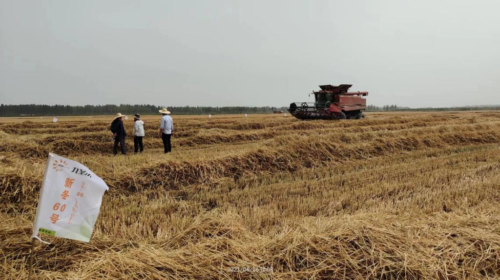 “新冬60号”是新疆农科院粮作所黄天荣团队联合新疆九丰禾种业有限责任公司,以“冀92-3160”和“津农1号”为亲本,历经10年选育而成的适宜南疆麦区气候特点的优良早熟高产品种,于2016年通过自治区农作物品种审定。该品种在生产上推广应用以来,因具备早熟、优质、高产、抗病的特性而受到农民的广泛欢迎。2022年该品种被自治区列为新疆小麦主推品种目录,在南疆四地州推广面积达59万亩,预计2023年冬播推广面积可超过100万亩。