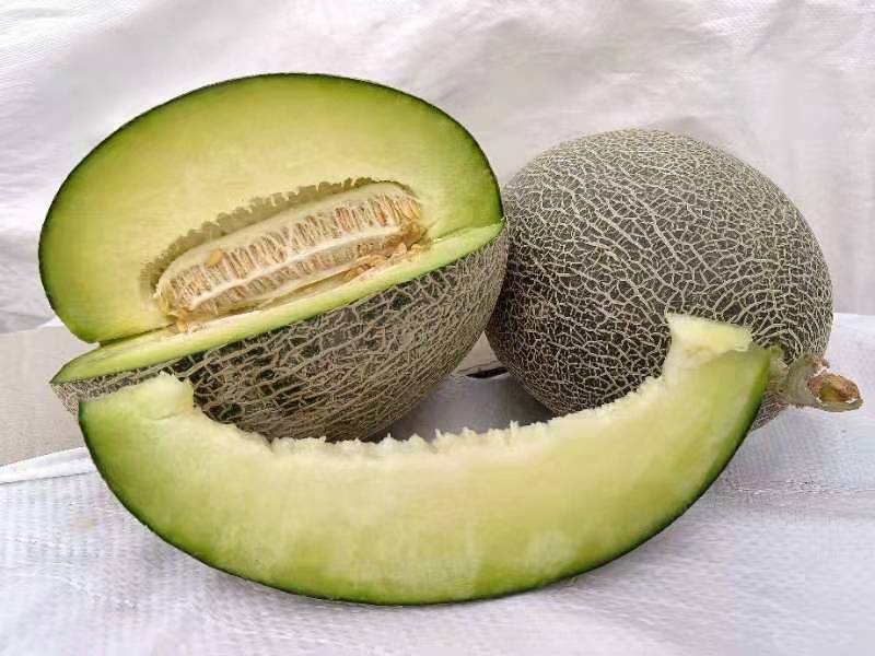 “翡脆”由我院哈密瓜研究中心翟文强研究员团队于2019年选育,品种登记号:GPD甜瓜(2019)650098号,该品种为中熟品种,植株长势强,抗病性好,果实发育期45天,果形呈短椭园形,果皮绿底覆细密全网,单果重2-3 kg,绿肉、肉质细、松脆爽口、香味浓郁,含糖量10.5-16%,适宜南疆露地栽培。“翡脆”的成功选育,促进了喀什地区甜瓜品种的更新换代。目前,该品种已在喀什地区示范推广3000余亩,平均亩产量达1.5-2吨,商品率高、价格好,深受当地瓜农的欢迎。