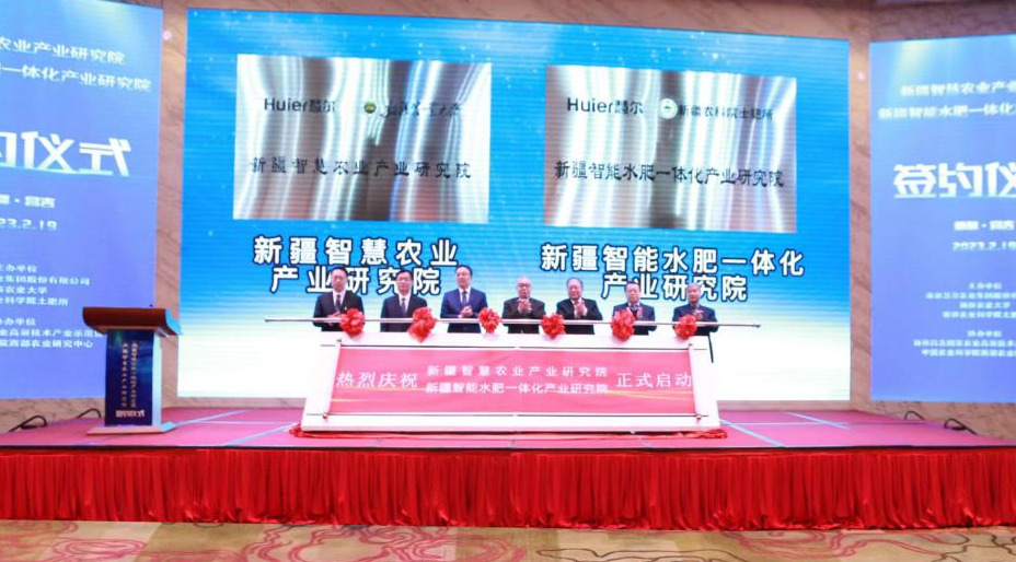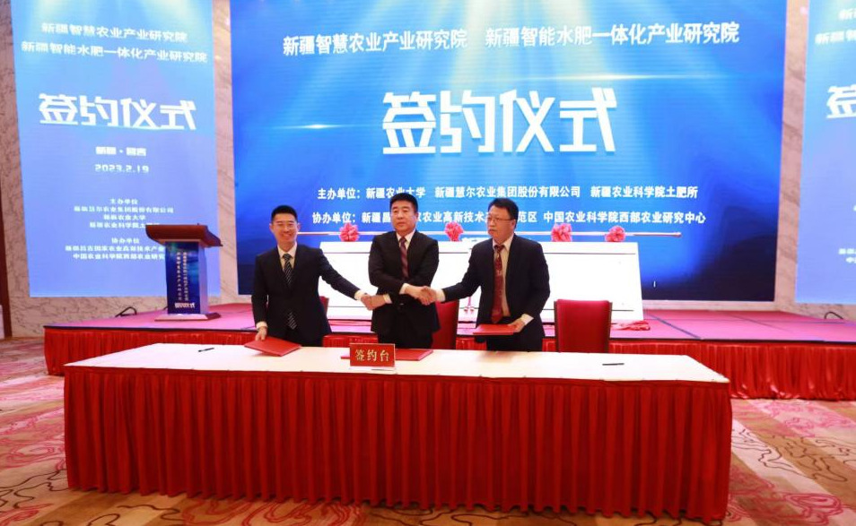 2月19日上午,由我院土肥所与新疆慧尔农业集团股份有限公司共同发起的“新疆智能水肥一体化产业研究院”(以下简称“产研院”)签约揭牌大会在昌吉州举行。中国工程院院士、石河子大学教授陈学庚,自治区党委统战部副部长、自治区工商联党组书记、常务副主席刘斌,自治区科学技术协会党组成员、副主席张煜,昌吉州党委常委、副州长张建军,新疆农业大学校长蒋平安,jc聚彩网党委委员、副院长王成,新疆慧尔农业集团股份有限公司董事长、总裁李保强等出席会议。自治区农业农村厅、自治区科学技术协会、昌吉国家农业科技园区、昌吉州党委、政府有关部门领导,jc聚彩网土肥所、科技成果转化中心主要负责人等相关人员参加会议。