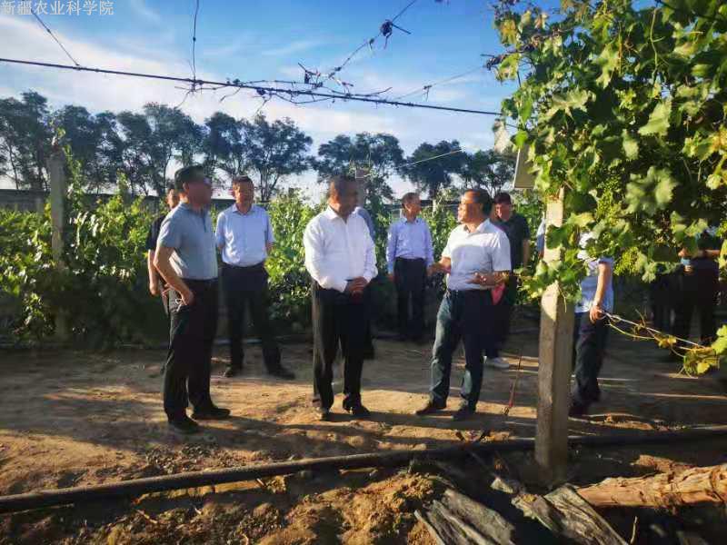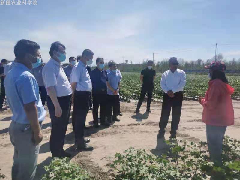 在我院玛纳斯农业试验站,艾尔肯·吐尼亚孜详细考察棉花和甜菜育种情况,与试验基地科技人员深入交流,仔细询问育种成果及种业发展现状。在我院综合试验场,逐一了解小麦、玉米、蔬菜、花生、食葵、加工番茄、辣椒、葡萄等作物的育种推广和成果转化情况,和科技人员亲切交谈,询问工作中遇到的困难和问题。他表示,长期以来,广大农业科技人员扎根边疆,立足区情,扎实开展育种攻关,取得了一大批丰硕的科技成果,在生产中也实现了大面积的示范推广应用,为新疆“三农”事业发展、脱贫攻坚和乡村振兴做出了巨大贡献,希望广大科技人员继续发扬农科精神,奋勇钻研,刻苦攻关,加大基础研究,努力保障我区种业安全,打造一支高层次农业科研人才队伍。
