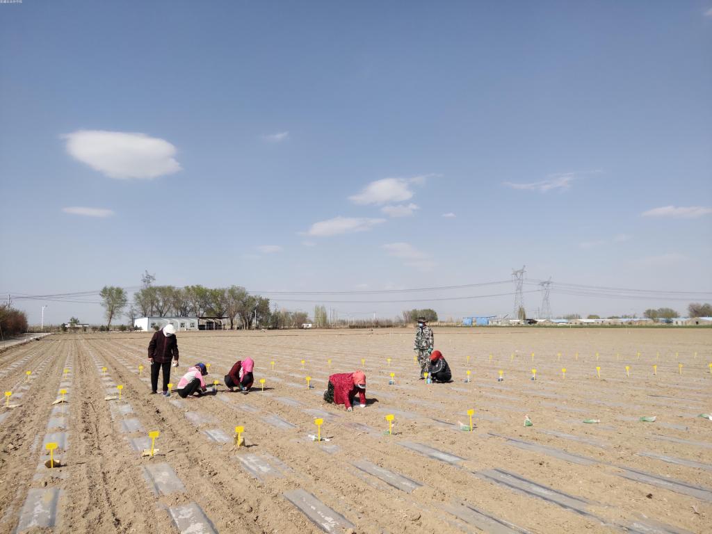 5月3日,经作所返聘退休人员徐建辉同志带领团队人员和昌吉农技中心老师们在昌吉佃坝乡查看新品种示范田出苗情况。