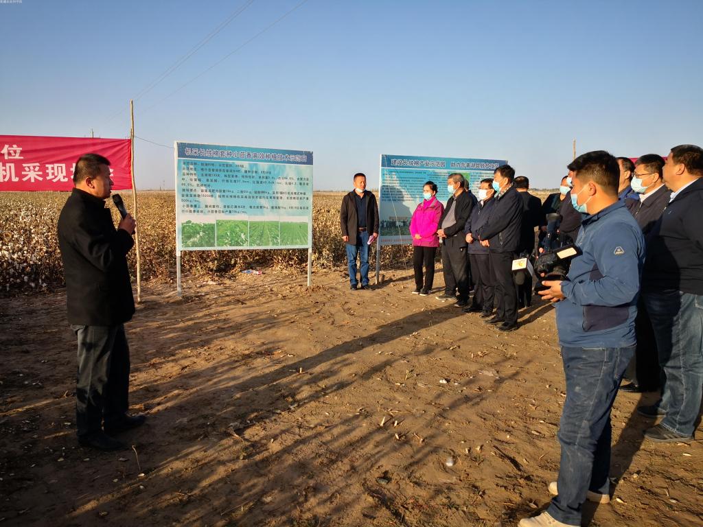 10月23日,由我院经作所、新疆棉花学会主办,岳普湖县农业农村局、喀什新粤纺织有限公司承办的“超高产长绒棉机采技术观摩交流会”在岳普湖县岳普湖乡4村召开。自治区人大常委会、自治区党委农办、科技厅、农业农村厅、新疆农业大学、喀什地区农业农村局、巴州农科院、兵团第三师农科所、岳普湖县等单位领导和专家代表、种植大户50余人观摩了长绒棉新海60号机械采收现场。