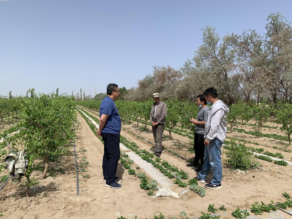 为切实做到疫情防控和农技服务两手抓、两不误,5月21日—23日,在哈密市农业技术推广中心推广站站长艾合买提·哈里克带领下,国家花生产业技术体系新疆综合试验站、院植保所、土肥所专家一行4人前往哈密国家级现代农业产业园区、二堡乡和黄田农场,对花生栽培模式、施肥量、出苗、苗期病虫害等方面情况进行了调研,对田间已经出现的花生根腐病、盐碱花生栽培技术及追肥问题进行了技术指导。