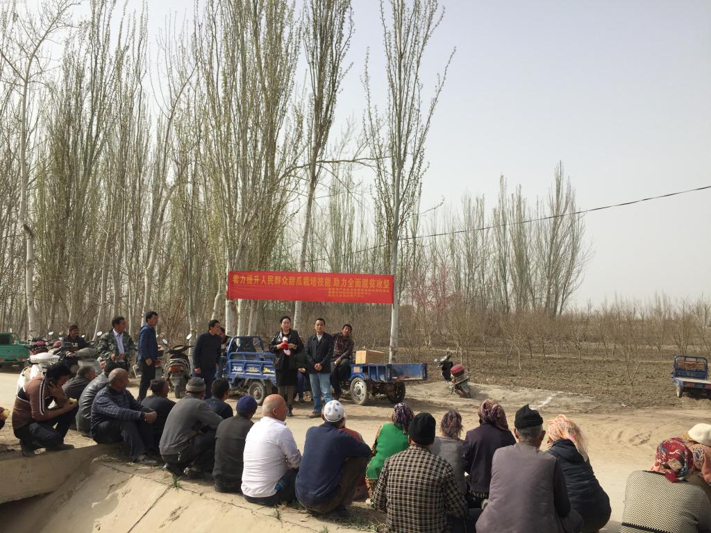为落实中央扶贫开发工作会议精神,我院哈密瓜中心伊鸿平研究员带领国家西甜瓜产业技术体系厚皮甜瓜改良岗位团队成员对英吉沙县甜瓜种植情况进行调研。英吉沙县甜瓜品种主要为吾然以力和卡拉克塞,市场以本地内销为主,年种植面积约1万亩,其中萨罕乡和英也尔乡种植面积最大,分别约3000亩和2300亩。3月29日,哈密瓜中心联合英吉沙县农业农村局在英也尔乡开展“西甜瓜栽培技术培训,助力全面脱贫攻坚”活动。40余名瓜农参加了本次培训。哈密瓜中心王登明就新疆甜瓜的种植历史、播种、蹲苗、灌水、整枝打杈、肥料使用、定果和病虫害防控等方面进行了详细介绍,英吉沙县农业农村局阿瓦古丽进行翻译,现场还分发了哈密瓜中心提纯复壮的“吾然以力”甜瓜种子和栽培技术手册。活动为萨罕乡和英也尔乡瓜农免费提供20kg甜瓜种子和少量由哈密瓜中心培育的新品种,鼓励瓜农进行试种。