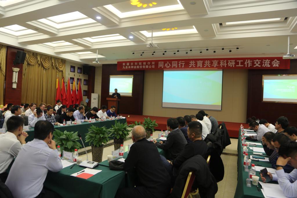 九圣禾股份公司执行总裁孙铭对公司近年发展状况、产品市场状况作了介绍。他表示,公司经营业绩的快速提升,得益于公司长期战略规划和新疆农科院所的紧密合作,公司长久发展必须深化、拓宽科企合作之路。粮作所副所长周安定表示,品种价值的体现,离不开种业的推广及成果转化,只有科研单位与种业公司紧密协作,并与当前政策及市场接轨,才能为农户带来更大的收益,才能体现科研单位的价值。