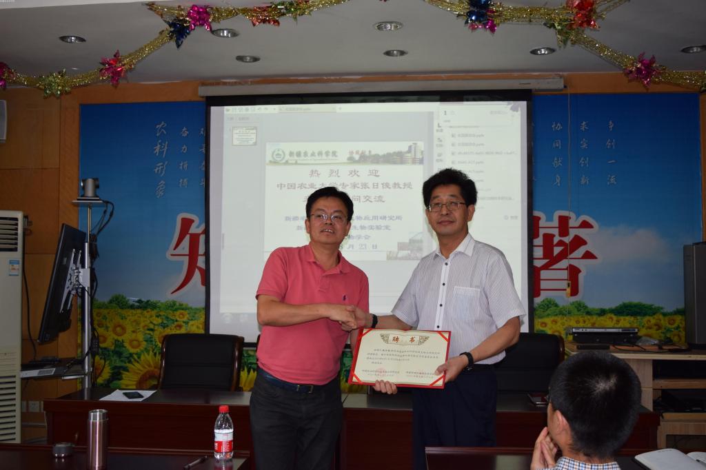 会上,张日俊教授作了题为《畜禽微生态制剂与饲用抗生素替代品研究与应用》的学术报告,并介绍了中国农业大学饲料生物技术实验室发展历程、研究领域、科研成果、科企合作、成果转化及今后的发展方向等方面的情况。他表示,新疆地质地貌多样,自然环境独特,农业和林果业有特色,微生物类群丰富多样,科学研究和开发价值巨大,特殊环境微生物资源领域的合作研究前景广阔。希望能充分发挥双方资源、学科、人才、技术等方面的优势,在今后的科研合作中实现资源共享、协同创新、合作共赢,共同利用好新疆特殊环境微生物资源,有效推动新疆特殊环境微生物研究从资源优势向技术转型,促进农业、畜牧业快速发展,切实服务新疆和祖国的建设。报告会后,微生物所郭文超所长向张日俊教授颁发了新疆特殊环境微生物实验室学术委员会委员聘书。