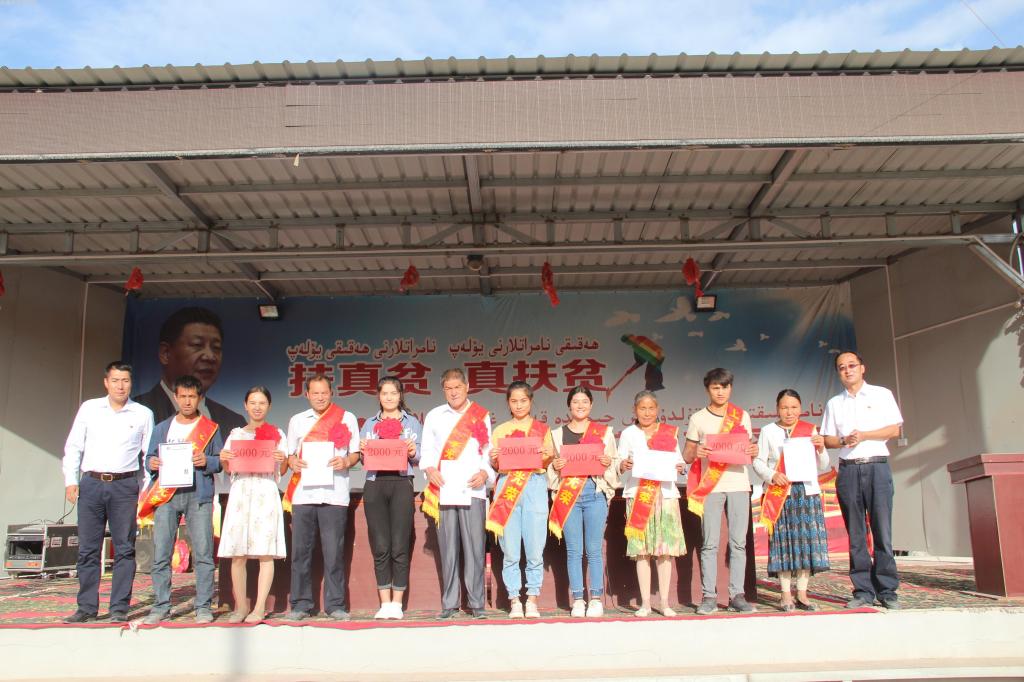 库木西力克村7名考入本科院校的大学生和父母受到了全村乡亲们的衷心祝福,每个人的脸上都洋溢着灿烂的笑容。台上披红挂彩,台下掌声雷动。受到表彰的7名大学生每人获得了2000元的助学奖励金,学生家长也获得了工作队准备的精美奖品。