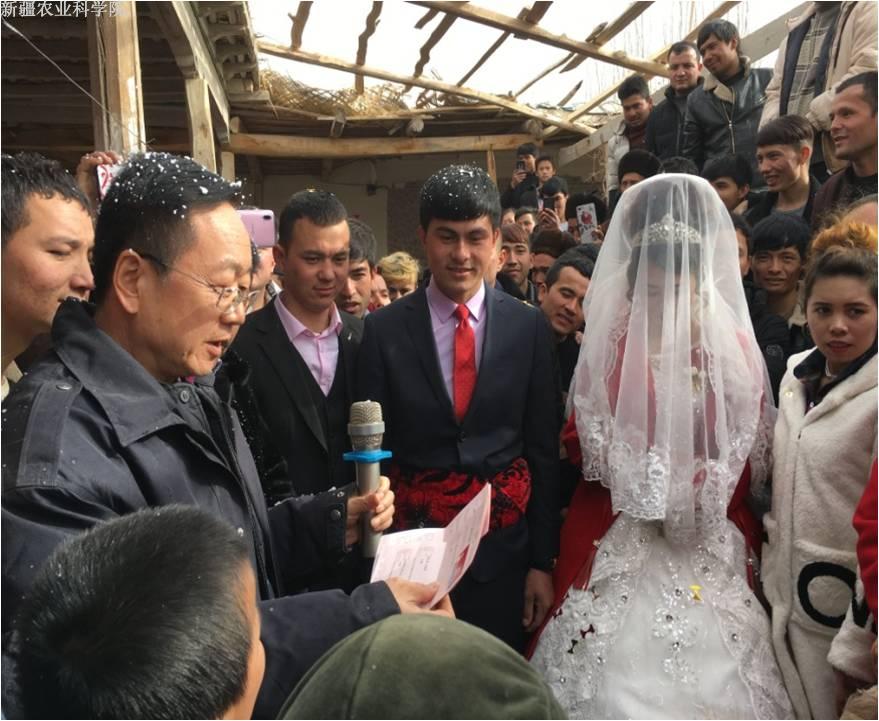 2月9日、10日,10村7组艾曼江·阿日普和10村8组萨比尔·麦合木提家中举办婚礼,一派热闹景象。结亲干部前来祝贺,他们特意做了抓饭、拌面招待大家。伴随着优美的音乐,大家一起跳起了欢快的麦西来甫。当身着盛装的新娘走出来时,全场响起热烈的掌声,彩带飞舞。我院“访惠聚”驻10村工作队队长张平为新人主持婚礼,农经信息所所长戴俊生代表全体职工向新人送上贺礼及新婚祝福。