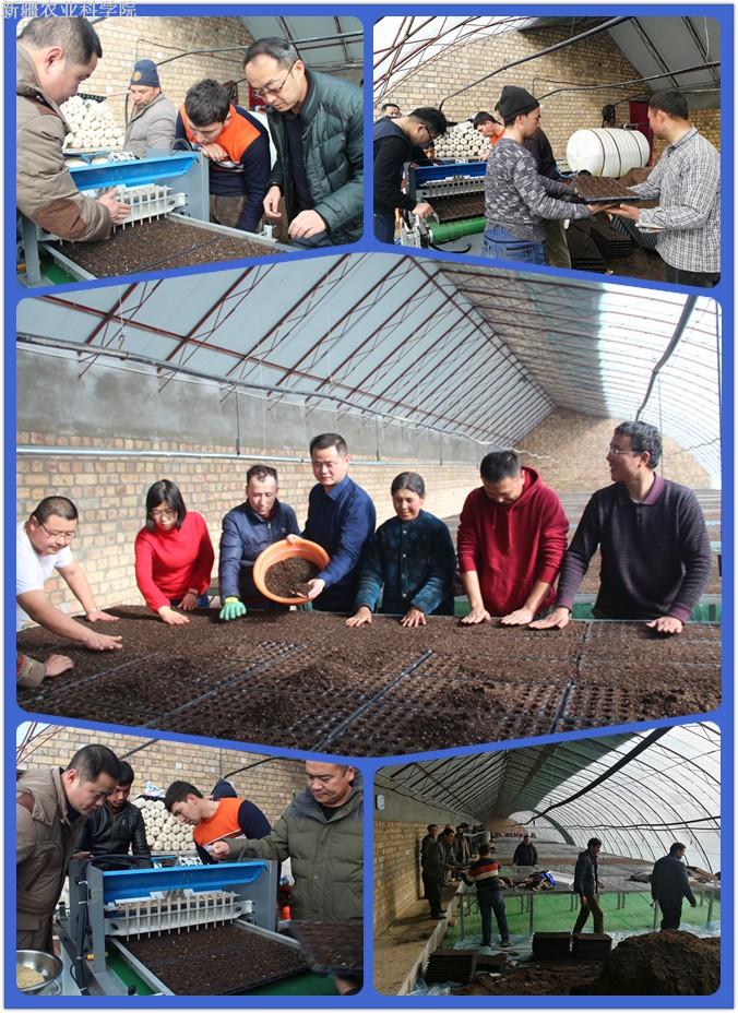 两座崭新的果蔬育苗温室里,我院驻库木西力克村“访惠聚”工作队组织结亲干部和村民们干得热火朝天。自动化的气吸式育苗播种机有条不紊地将一粒粒蔬菜种子精准地播入育苗盘里,装基质、点种子、查质量、送苗盘、摆苗床,大家分工明确,俨然一条现代流水线。