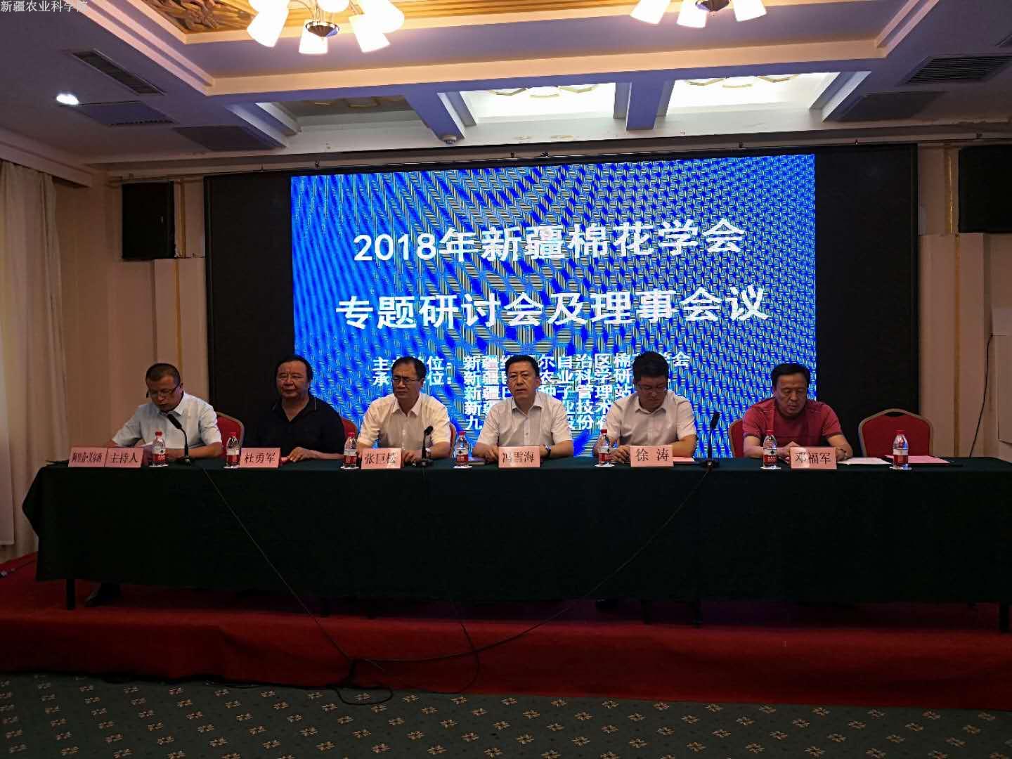 8月25日—26日,由新疆棉花学会主办,巴州农业科学研究院、巴州种子管理站、巴州农业技术推广中心、九圣禾种业股份有限公司承办,新疆农科院经作所协办的新疆棉花学会2018年专题研讨会及理事会议在库尔勒召开。大会主题是“发展绿色棉业、推动乡村振兴”。来自全疆各地州的50多家科研院所、大专院校和企业及推广单位的近150名代表参加了会议。巴州副州长冯雪海出席会议并讲话。新疆棉花学会秘书长阿里甫·艾尔西主持会议。