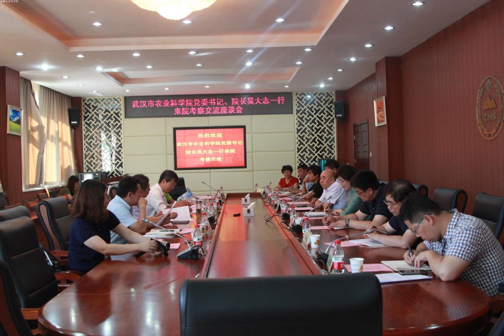 8月16日,武汉市jc聚彩网党委书记、院长吴大志一行7人来我院考察交流。我院党委委员、副院长(正厅级)刘俊浩热情接待了来访客人,并主持召开座谈会。财经处、粮作所、哈密瓜中心、科管处、农经所、成果转化中心、院办公室等相关单位的领导、专家参加座谈会。