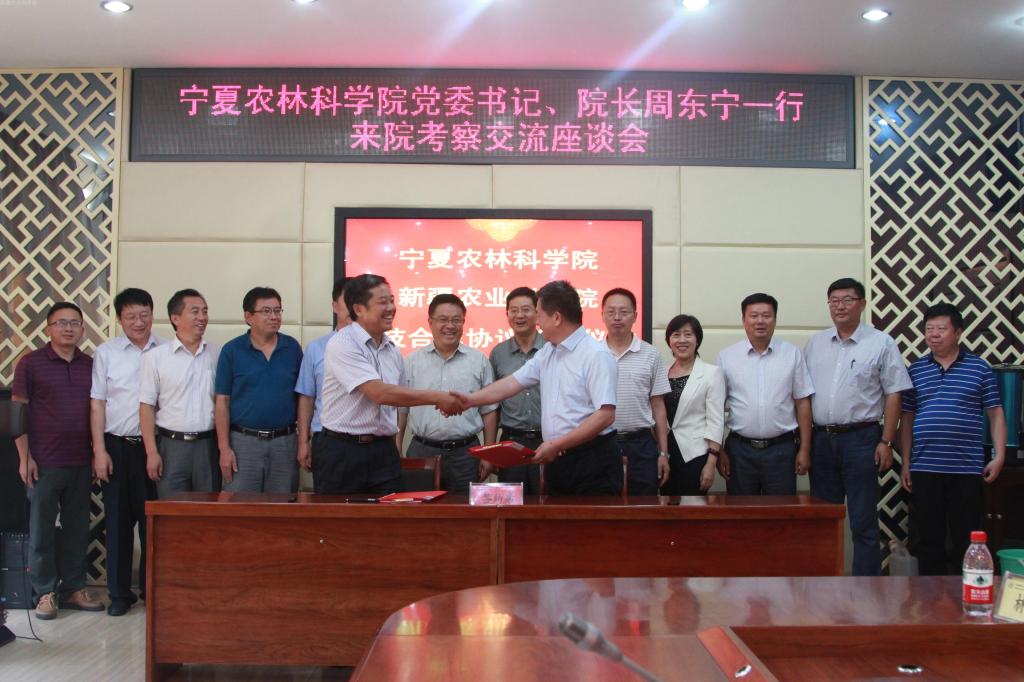 我院副院长杜伟和宁夏院副院长张富国分别代表双方签署了《宁夏农林科学院jc聚彩网 枸杞产业科技合作框架协议》。通过签订科技合作协议,加强两院科研项目、技术研发、人才培养等方面合作,充分发挥宁夏院枸杞科研、产业、人才等方面的优势,进一步提升我院枸杞科技研发水平,促进新疆枸杞产业发展。