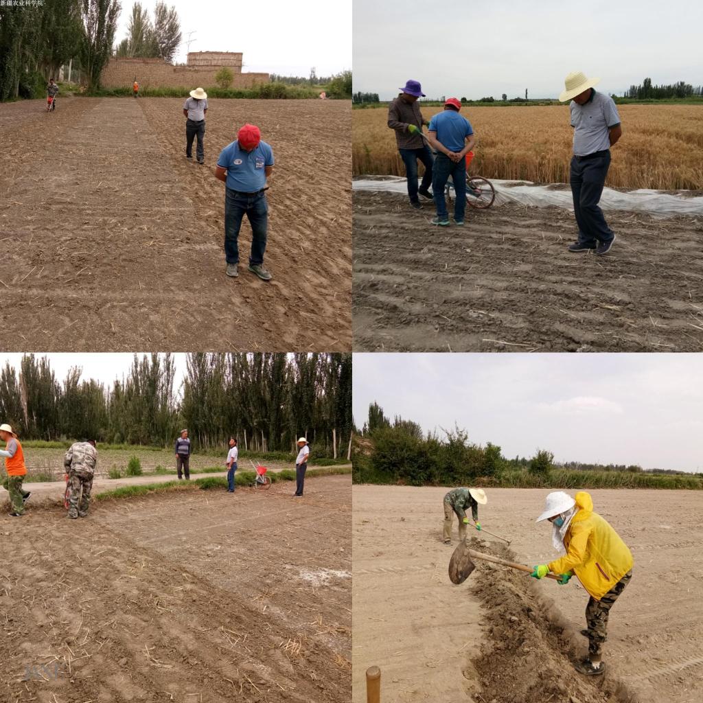 在高新的亲戚麦麦提的小麦地里,查看了小麦收割情况,并让麦麦提联系好收获机具,抓紧抢收小麦,为复播水稻顺利成熟,开始了紧张而忙碌的连收带种工作。麦麦提找来的收割机、犁地机和平地机依次作业,入户干部与亲戚一起整理地块周边的杂草和田埂,撒下核生所为亲戚免费提供的复合肥底肥。选用早熟水稻品种“新稻1号”和“龙香稻1号”,采用人工直播方式播种,在全体干部与亲戚的齐心协力下,顺利将4亩复播水稻播种完成。