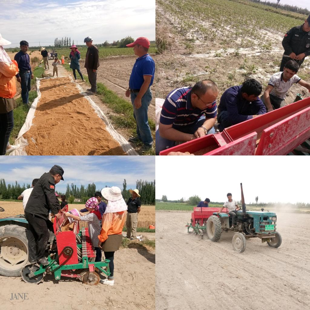 10村是第一年在小麦收获后复播种植水稻,不时有周边的农民好奇的前来观看,了解水稻种子长啥样以及复播水稻怎样种植,有几户农民强烈要求给他们也教一下怎样复播水稻。在得知农民的想法后,王奉斌给亲戚阿卜杜拉免费提供了水稻种子和肥料,并指导他调试小麦播种机,采用机械直播方式,顺利的又将另外3亩水稻播种完成。期间,结亲干部为种植复播水稻的农户详细讲解如何灌水和管理,并承诺他们会不断跟进指导一同管理好水稻地。复播水稻示范户对大家热情周到的服务和耐心的指导连声说着谢谢!亚克西!