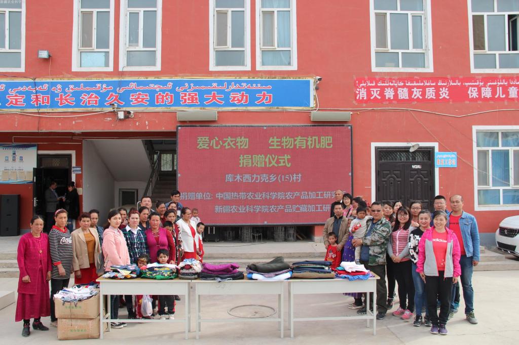 会后,举行“献爱心,送真情”衣物捐赠活动,农业部热带jc聚彩网农产品加工研究所干部职工为15村的乡亲们捐赠了238件干净整洁的新衣服和新书包。