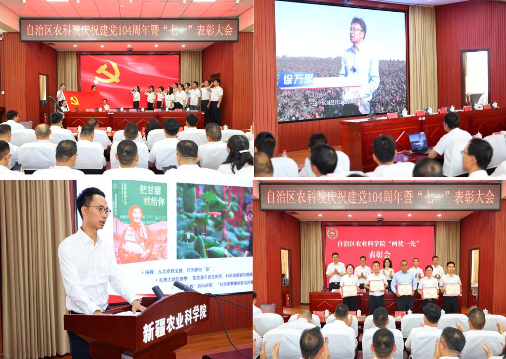 会上,宣读了“两优一先”表彰决定,为获评自治区“五个好”标准化规范化党支部、区直机关“五个好”党支部示范点荣誉称号的棉花研究所党支部,57名优秀共产党员和18名优秀党务工作者颁发荣誉证书。大会还举办了入党宣誓仪式,9名新发展党员高举右拳,面向党旗庄严宣誓;展播了18个党支部选送的23个“农科先锋身边好榜样”微视频参赛作品,12个作品脱颖而出,分获一二三等奖;开展了《把甘甜献给你——吴明珠院士传》读书分享活动,5名青年博士登台分享吴明珠院士勇担时代使命的科学家精神和对自己科研事业的启迪。