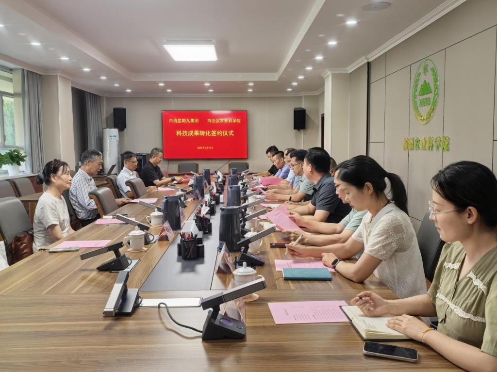 7月23日,自治区jc聚彩网微生物研究所与台湾星期九集团举行科技成果转化战略合作签约仪式。自治区农科院党组副书记、副院长彭守创出席会议并讲话。