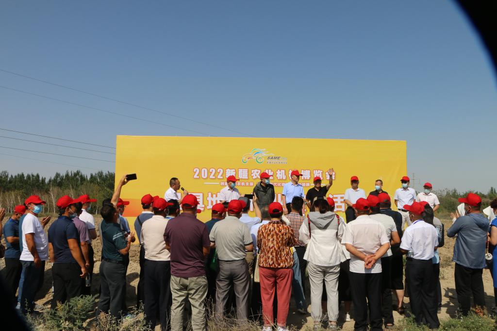 7月5日,由中国农业机械流通协会、新疆自治区农业农村机械化发展中心主办,新疆农牧业机械化技术推广总站、新疆农业机械流通协会、新疆农科院综合试验场、新疆国际会展有限公司承办的2022新疆农业机械博览会机具地头作业现场演示活动在新疆农科院综合试验场举办。新疆农业农村机械化发展中心党委书记,一级巡视员谢国政主持活动。本次博览会以“创新引领农机支撑,给农业现代化插上科技的翅膀”为主题,借助新疆农科院综合试验场“全国科普教育基地”平台向南北疆及兵团的代表等300余人现场科普农业机械化和种养殖设备、技术及知识,让现代化农业知识走进群众。一是现场观摩了新研股份、新疆天农神力等8家企业的田间智能灌溉系统、轮式拖拉机+自动导航系统、自走式大蒜播种机、青贮收获机、折叠割台玉米籽粒收获机、大型喷雾机、螺旋式侧走式开沟机等近20种先进技术与装备的地头作业实地演示;二是参观了综合试验场蔬菜认领农场教育实践地、新疆农业博览会蔬菜田间展示基地、国家标准化育肥牛基地,观摩国内外1300余种名优特蔬菜品种,观看育肥牛养殖场、TMR技术设备等,听取专家讲解蔬菜种植技术及育肥牛养殖技术。