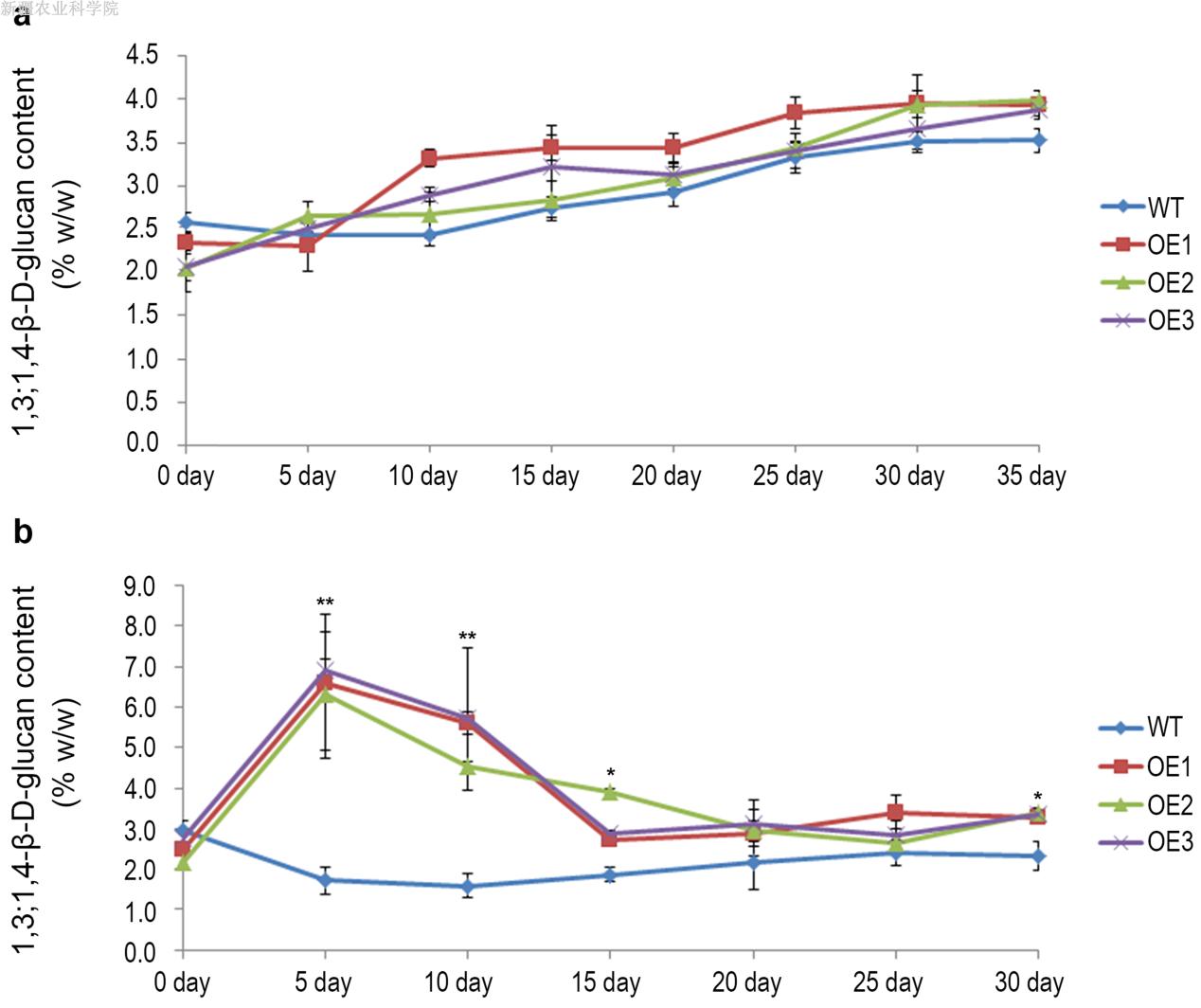 WT和转基因植物中β-d-葡聚糖生物合成基因的RT-qPCR表达分析