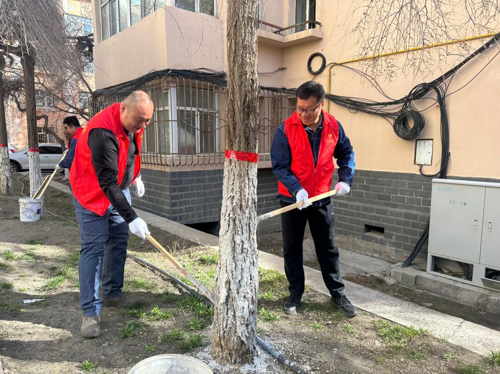 活动现场,52名党员志愿者和物业服务人员组成护绿小分队,按照树木养护规范要求,有序开展石灰涂料调配、树干粉刷、防虫胶带缠绕等作业。经过3个小时的努力,顺利完成自治区农科院北区全部树木的养护工作。
