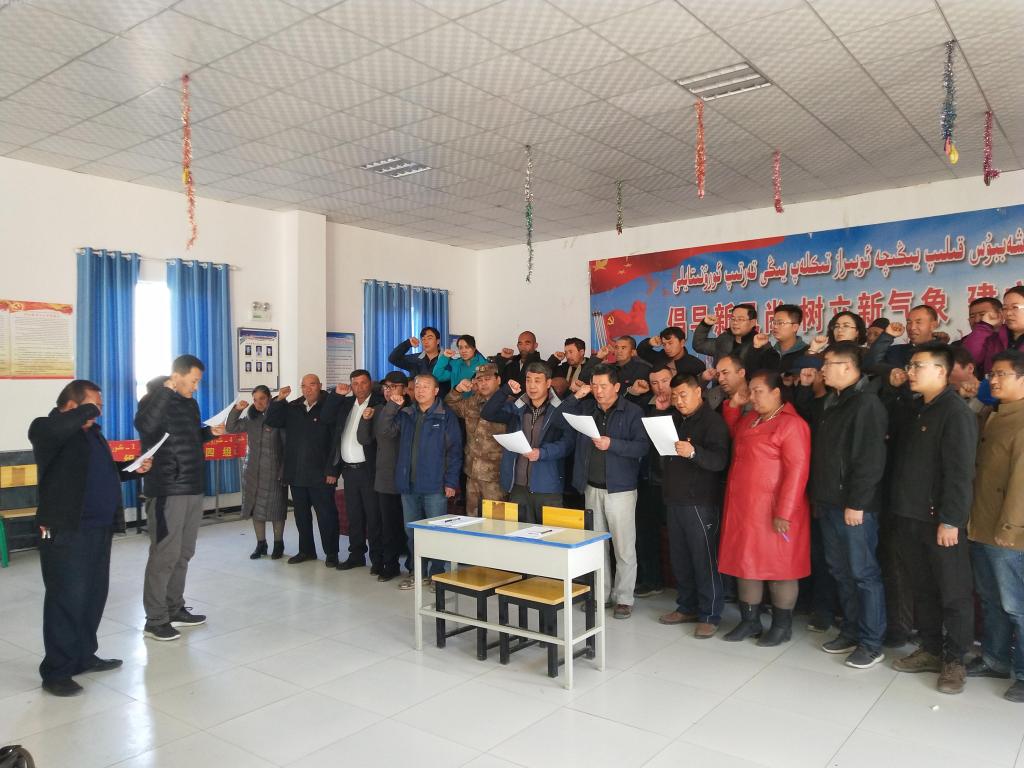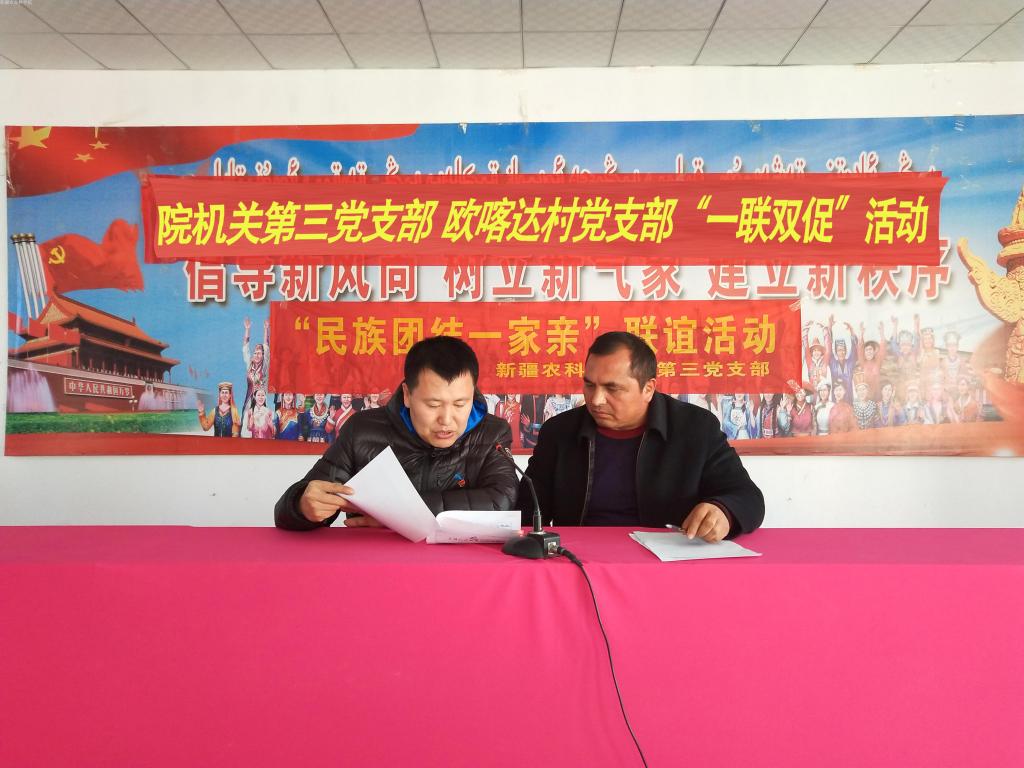 在欧喀达村村民活动中心,双方党支部签订了“一联双促”协议书,我院党委委员、副院长杜伟主持了签订仪式,协议签订以后,机关第三党支部、欧喀达村党支部全体党员及部分村民,共同开展了发声亮剑活动,作出坚决维护社会稳定和长治久安总目标、合力推进脱贫攻坚的庄严承诺。随后,机关第三党支部书记、科研管理处副处长王利永同志以《正确认识新疆历史问题》为题,从正确认识新疆历史、还原历史真相、澄清错误认知、树立正确观念、提高辨别能力等方面,为在座的党员讲了一堂生动的党课。