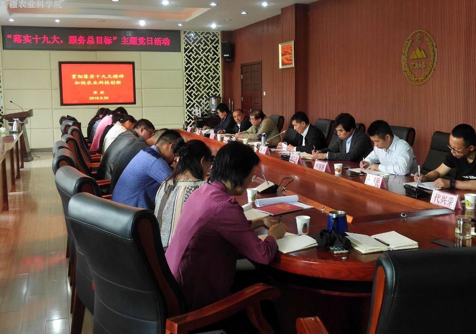为深入学习贯彻落实党的十九大精神,5月30日下午,院机关第三党支部与哈密瓜中心、生物质能源所、加工所4个党支部联合开展以“落实十九大,服务总目标”为主题的党日活动,院党委委员、副院长康威结合自己学习十九大精神的经验和体会给大家上了一堂生动的党课。此次党课是院机关第三党支部深入“学习十九大精神”系列活动的一项重要内容。院机关第三党支部书记王利永、科研管理处处长王成、哈密瓜中心党支部书记冯炯鑫、哈密瓜中心主任伊鸿平、生物质能源所党支部书记克依木·卡地尔、生物质能源所副所长王梓名、加工所副所长林丽静、科研管理处副处长代兴荣以及党员代表共30余人参加了学习。