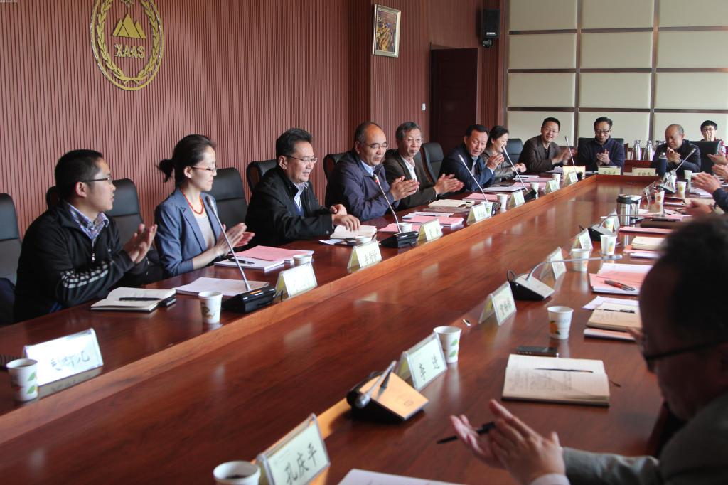 首先,朱政书记向甘昶春主任一行介绍了我院参会人员,并代表我院对自治区党委农村工作办公室一直以来对我院科技工作的大力支持表示衷心感谢,对甘昶春主任一行来我院调研指导工作表示热烈欢迎。
