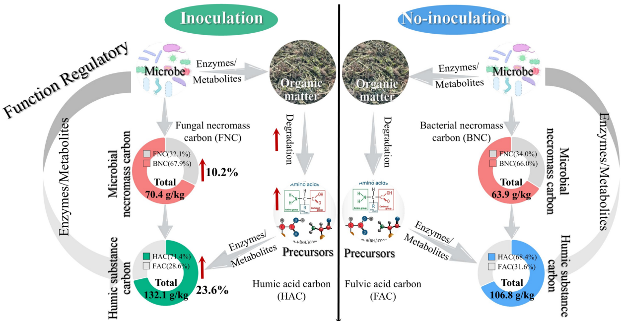 近日,自治区农科院微生物研究所农业有机物处理与资源化利用创新团队在《Bioresource Technology》(IF=9.0/Q1)发表了题为“Regulating humus formation via improved conversion of microbial necromass and plant lignin during vegetable straw composting with inoculation”的研究论文,揭示了好氧堆肥中促进植物和微生物残体向腐殖质碳转化的生物强化机制。