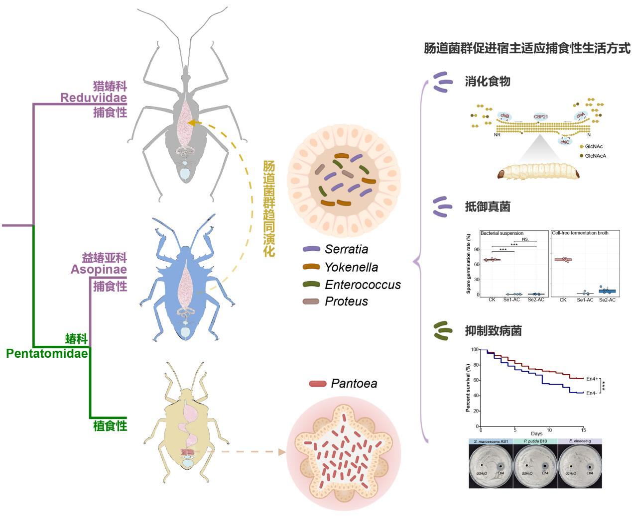结合宏基因组、单菌基因组及体内外功能验证,研究进一步揭示:尽管捕食性蝽类昆虫摄入的营养更为丰富,其肠道菌群仍发挥着不可或缺的作用—不仅能协助降解猎物来源的几丁质等难消化成分,还能增强宿主对食物及环境源病原微生物的抵抗力,这些功能共同促进了宿主的食性转变。